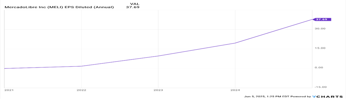 When Mercado Libre made its investments five years ago, EPS was $0-1 since all its operating earnings were being reinvested. Now that it has matured, the business realized EPS of over $37 at the end of 2024 and current estimated EPS of over $48 per share this year!