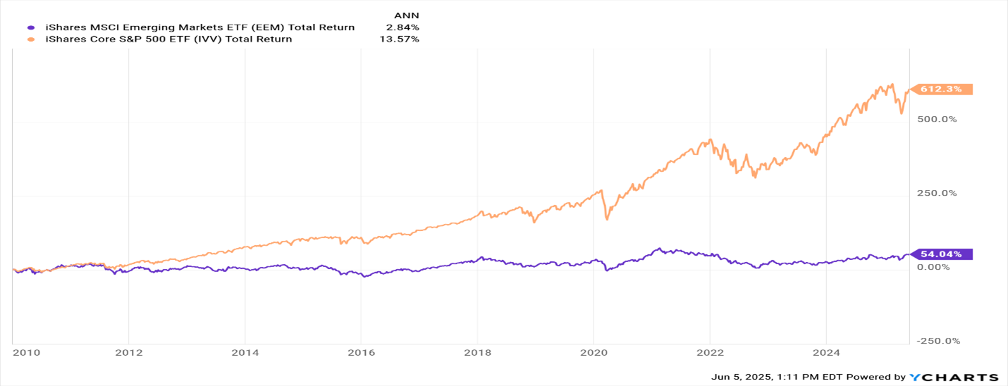 1.iShares MSCI Emerging Markets ETF (EEM) & iShares S&P 500 Annualized Total Return 1/1/2010 – 6/5/2025